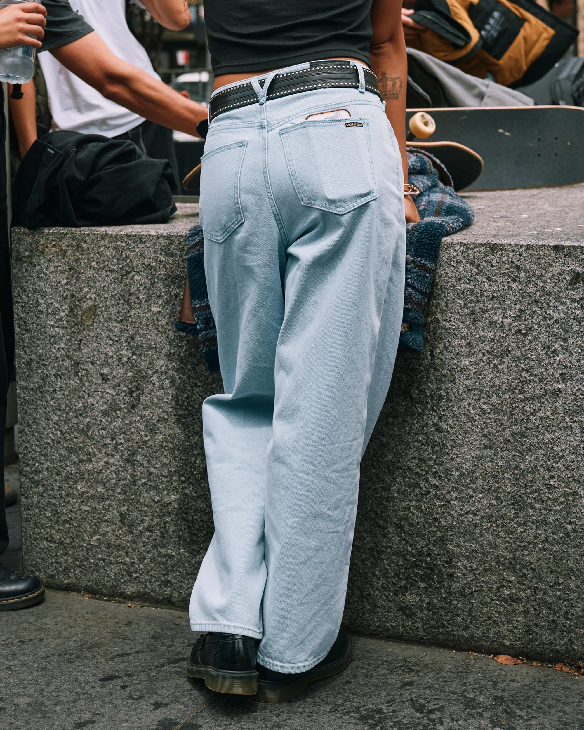 - Volcom script embroidery at back right patched
